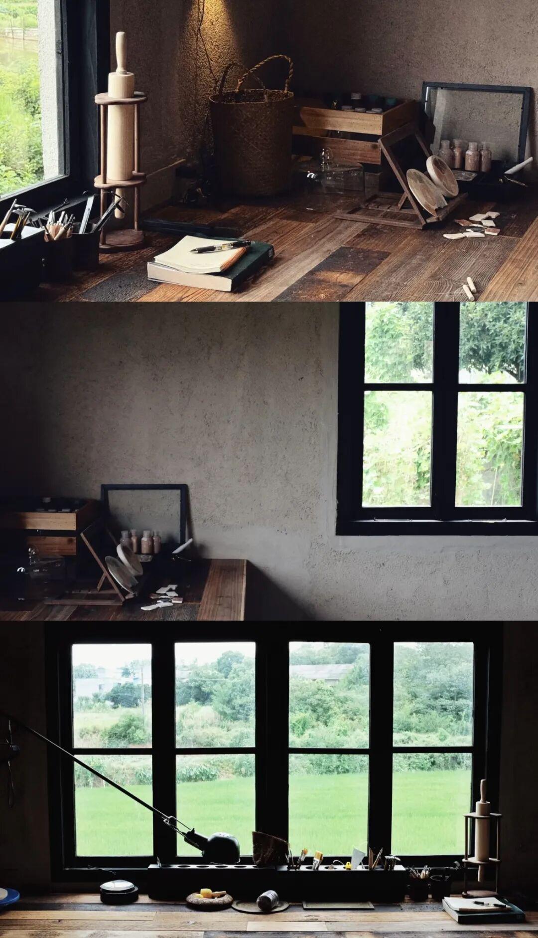 外面加建了一间陶艺和金工工作室,三面都开了长窗,朝东看是院子,朝南看是田野,朝西看是菜地,每天摘了菜就可以从这个窗口传递。