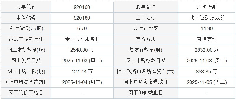 北矿检测2025年10月30日披露的向不特定合格投资者公开发行股票并在北京证券交易所上市发行公告 显示,若本次发行成功,预计公司募集资金总额18,974.40万元六六配资,扣除预计发行费用1,726.90万元(不含增值税)后,预计募集资金净额为17,247.50万元。