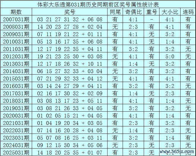 体彩大乐透第031期历史同期开出19次奖号,其统计详见下表: